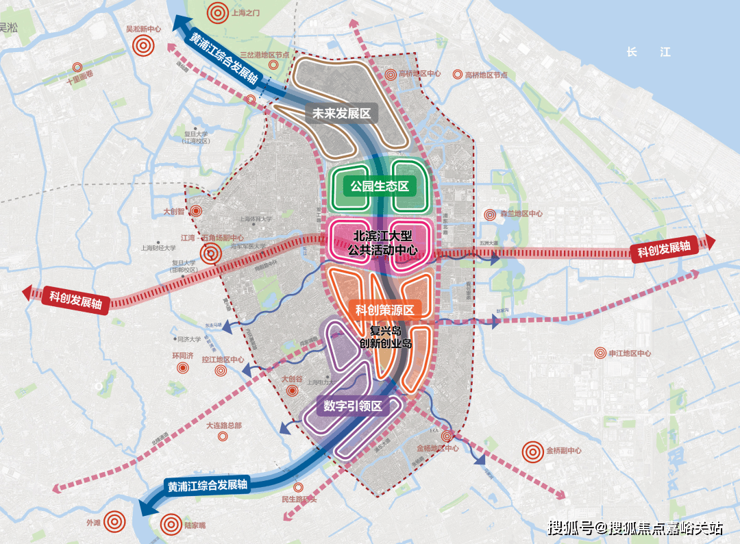 黄浦滨江中北部最新规划“一心”为两轴交汇处形成北滨江公共活动中心。依托黄浦江、复兴岛运河、虬江三水交汇的区位优势 和景观特质,布局标志性的大型体育文化场馆,联动共青森林公园和滨江优质景观资源,塑造文体商旅展一 体化发展的市级滨水公共活动中心。