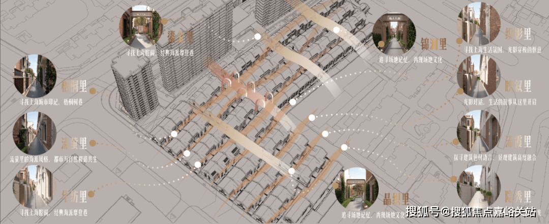 难得的是,项目以“摩登城市的里弄生活”为精神载体,通过对场地历史与上海城市记忆的深度转译,构建了一套独具海派风情的巷道命名体系。整体规划以“鱼骨状”布局为肌理,致敬传统里弄的烟火气与邻里感。
